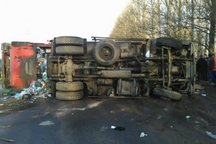 В патрульной полиции рассказали, что водитель мусоровоза пытался совершить обгон трактора и не справившись с управлением, допустил опрокидывание грузовика. На момент ДТП в автомобиле также находились два пассажира.