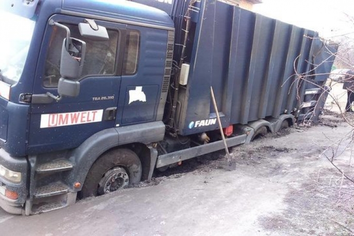 Мусоровоз подняли с помощью автокрана. В результате на дороге образовалась яма площадью 80 квадратных метров и глубиной в 1,5 метра.