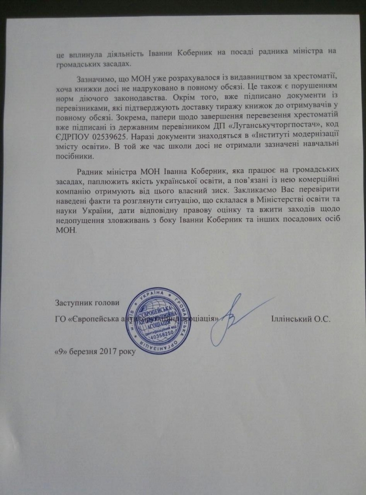 "Издание хрестоматий не было предусмотрено в Паспорте бюджетной программы МОН на 2016 год. Поэтому, согласно действующему законодательству, эти книги не могли печататься за государственные средства. Однако советник министра образования и науки Иванна Коберник осуществила давление на должностных лиц МОН, чтобы добиться печати хрестоматий", - говорится в обращении.