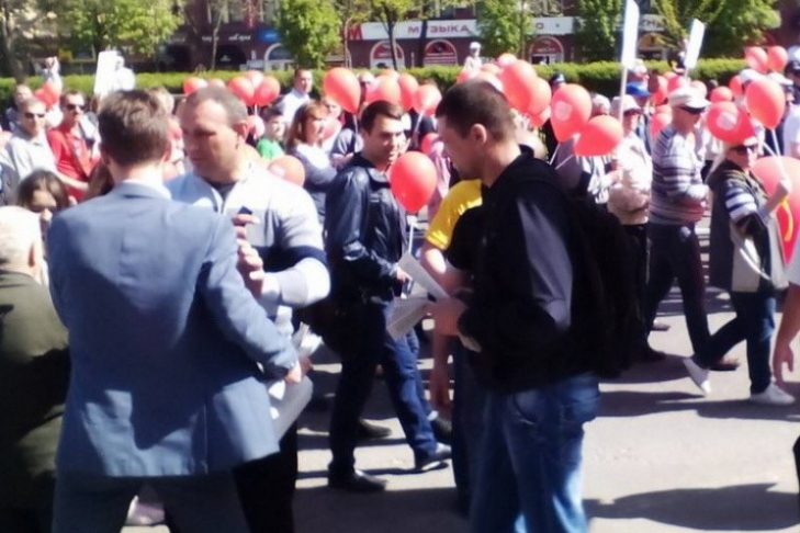 Профсоюзные митингующие пытались вручить социалистам открытки, но мужчины спортивной внешности запрещали это делать. Началась толкотня, которую быстро разняли полицейские.