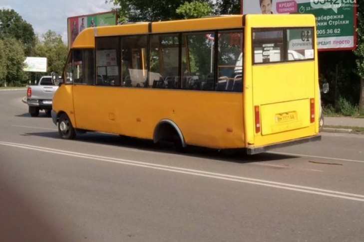 В Сумах на ул. Набережной напротив центрального рынка 6 сентября у маршрутки оторвалось заднее колесо. Как результат – на асфальте остались следы от трения транспорта с асфальтом, сообщает 112.
