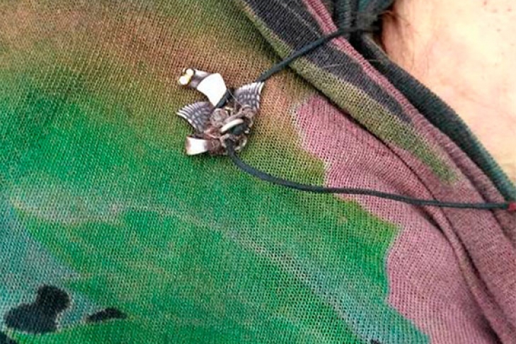 Была одета: куртка осенняя черного цвета, юбка до колен черного цвета, кофта черно-зеленого цвета, майка желтого цвета, вьетнамки желтого цвета, на шее черный шнурок с металлическим украшением в виде птицы.