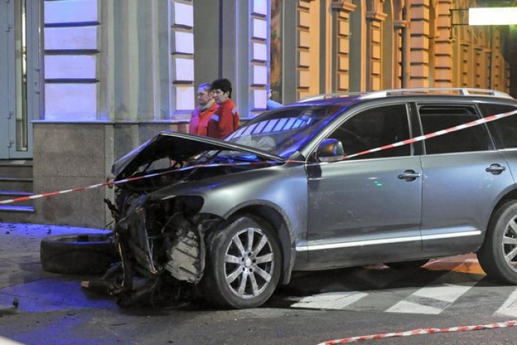 После удара с Volkswagen Touareg, Lexus RX 350 врезался в столб, перевернулся и вылетел на тротуар, где смял пешеходов.