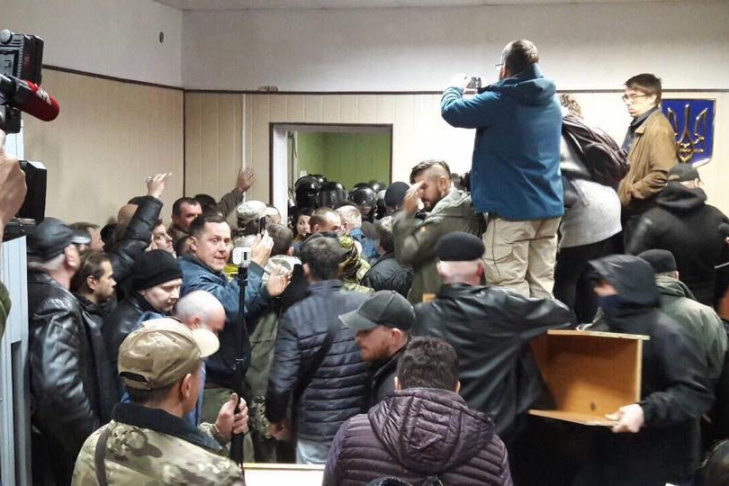Как сообщалось, руководителя организации "ОУН" Николая Коханивского задержали по обвинению в хулиганстве 21 октября. Между ним и Русланом Качмалой (позывной "Рэм") возник конфликт, который перерос в драку и стрельбу. Николай Коханивский несколько раз попал в "Рэма" из пистолета, стреляя резиновыми пулями. 23 октября суд перенес заседание на 09:00 24 октября. Защита Коханивского заявила, что к тому времени закончится срок предварительного задержания и полиция не имеет права конвоировать его снова в изолятор. Это стало причиной того, что группа сторонников Коханивского забаррикадировалась в зале заседания в Святошинском районном суде Киева, где и рассматривался вопрос об избрании меры пресечения Коханивскому.