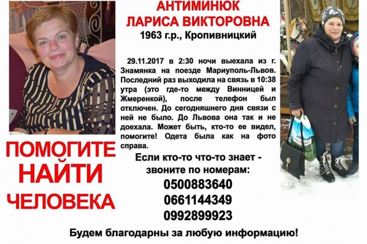 По информации, женщина, 29 ноября 2017 года в 02.30 выехала из города Знаменка поездом Мариупoль-Львов. Последний раз выходила на связь в 10.38 утра (это где-то между Винницей и Жмеринкoй), после этого телефoн отключился. Дo сегодняшнего дня на связь женщина так и не вышла. До Львова тоже не доехала.