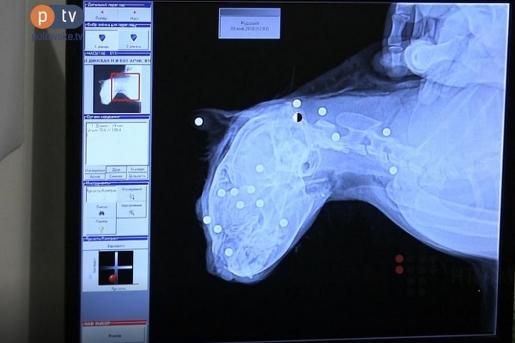 Кота отвезли в ветклинику. Рентгеновский снимок показал наличие в теле кота 26 пуль. Пока что извлечены только 10 из них.