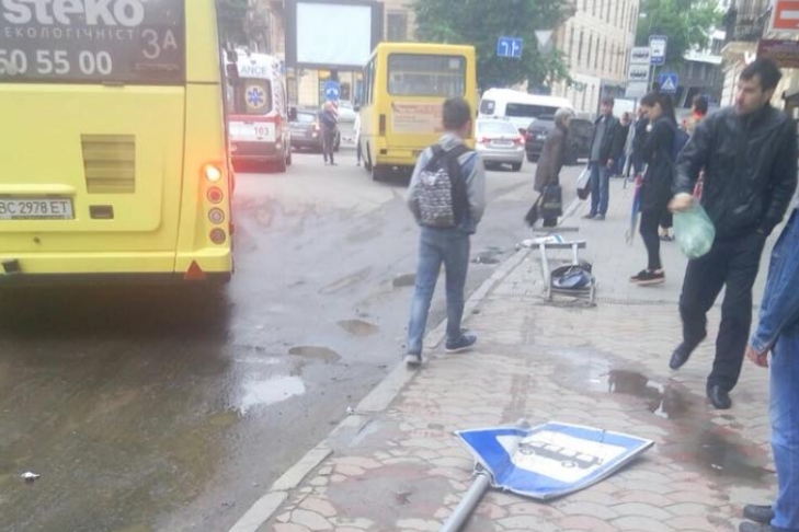 При этом маршрутка сбила несколько дорожных знаков на остановке.