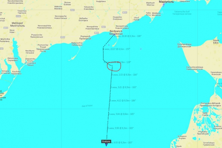"05.06.2018 примерно с 00:00 до 02:00 на расстоянии 11,7 миль на юг от Бердянской косы пограничниками ФСБ РФ задержан болгарский сухогруз EVALUNA (IMO: 9590773) с украинским экипажем. Судно идет из Бердянска в Стамбул", - говорится в сообщении.
