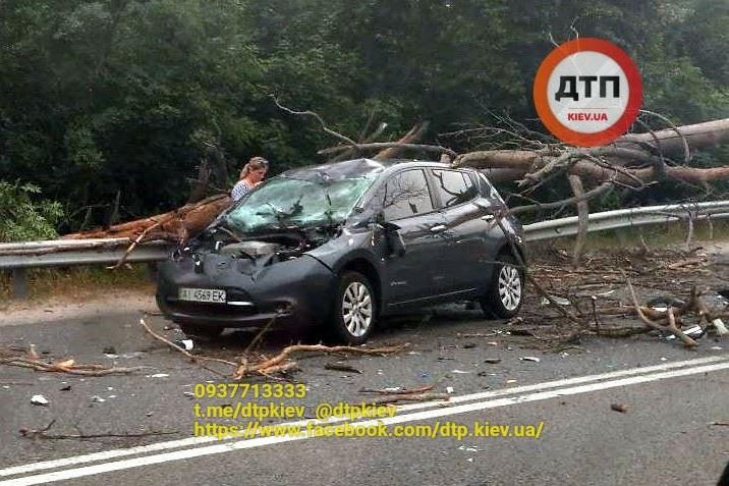 Под Киевом на трассе в пятницу, 22 июня, дерево упало поперек дороги и раздавило автомобиль Nissan Leaf, сообщает dtp.kiev.ua