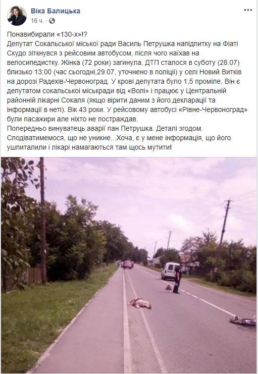Член полицейской комиссии в областном управлении патрульной полиции Вика Балицкая сообщила, что за рулем был депутат Сокальского городского совета Василий Петрушка.