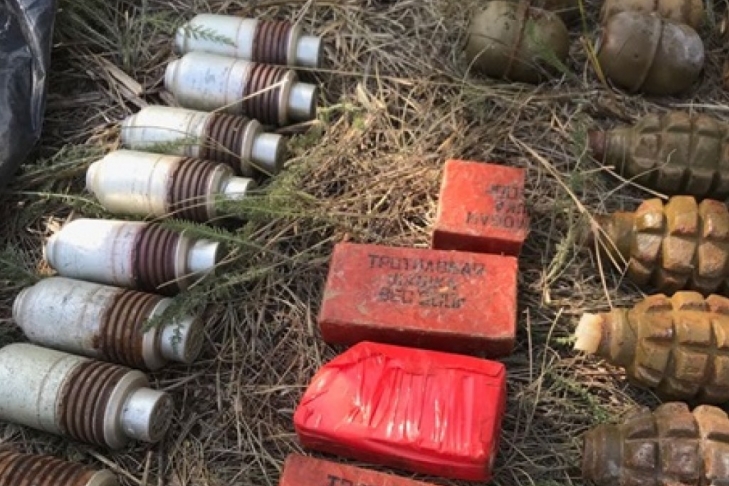 Правоохранители изъяли из тайника четыре тротиловых шашки, три детонаторы, восемь выстрелов к гранатометам ВОГ-25 и ВОГ-25П, более 400 патронов различного калибра, 19 гранат РГД-5, 17 гранат Ф-1 и 16 запалов к ним.