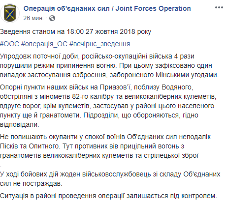 В течение текущих суток, 27 октября, по состоянию на 18:00, российско-оккупационные войска четыре раза нарушили режим прекращения огня. При этом зафиксирован один случай применения вооружения, запрещенного Минскими соглашениями. Об этом сообщил пресс-центр операции Объединенных сил, пишет Сегодня.