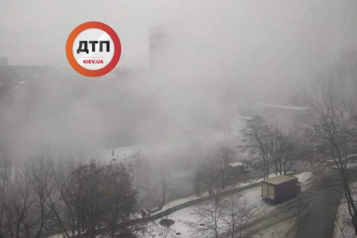 В Киеве возле школы им. Лобановского прорвало трубу с горячей водой.