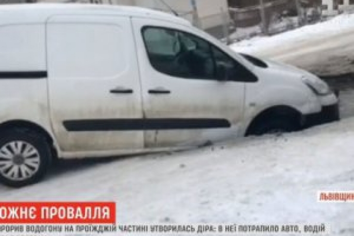 Во Львовской области автомобиль провалился под асфальт из-за прорыва водопровода.