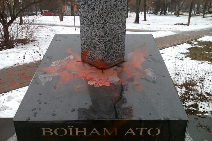 В Киеве вандалы облили красной краской памятный знак погибшим бойцам антитеррористической операции на Донбассе, установленный на пересечении проспекта Леся Курбаса и улицы Академика Королева.