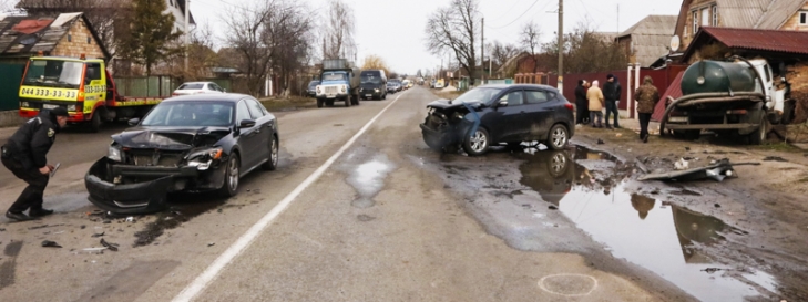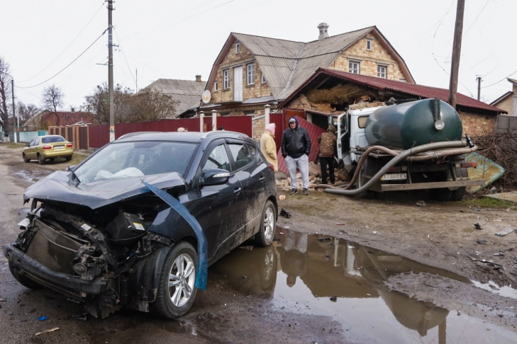 Авария произошла около 07:55 утра. По словам водителя Hyundai, он ехал в сторону Киева и притормозил перед пробкой. В этот момент в него врезался Volkswagen. От удара Hyundai выбросило на полосу встречного движения, где он столкнулся лоб в лоб с ассенизатором. После этого грузовик вылетел с проезжей части и протаранил гараж.