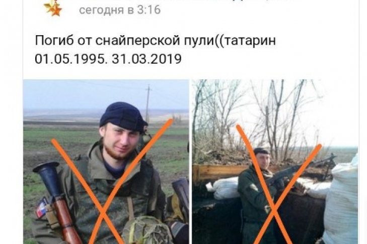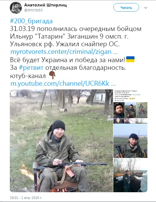 "200_бригада 31.03.19 пополнилась очередным бойцом Ильнур "Татарин" Зиганшин 9 омсп. г. Ульяновск РФ. Ужалил снайпер ОС", - говорится в сообщении.