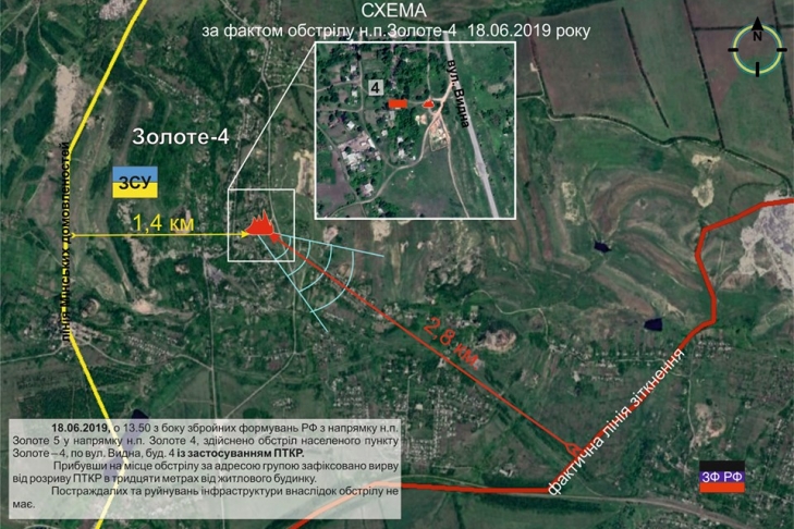 "Российско-оккупационные войска со стороны Золотого-5 обстреляли населенный пункт Золотое-4, применив ПТРК. На месте обстрела, в тридцати метрах от жилого дома, образовалась большая воронка от разрыва противотанковой управляемой ракеты. К счастью обошлось без жертв", – говорится в сообщении.