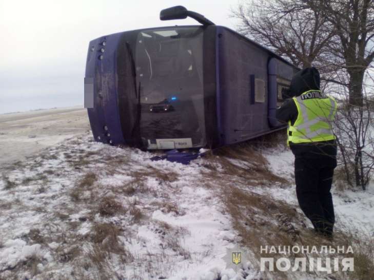 Предварительно установлено, что водитель рейсового автобуса сообщением Одесса-Киев не справился с управлением на скользкой дороге, в результате чего автобус с 19 пассажирами перевернулся.