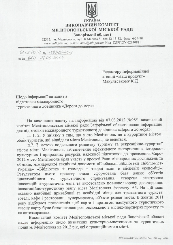 С целью дальнейшего развития туризма и рекреационно-курортной сферы города Мелитополя, обеспечения эффективного использования историко-культурных и природных ресурсов, надлежащей подготовки к проведению ЕВР-2012, город Мелитополь участвовал в проектах Совета международных исследований и обменов: международной технической помощи «Глобальные Библиотеки «Библиомост-Украина» и «Библиотека + община = творцы перемен в местной экономике». Результатом реализации этих проектов стала сформированная база данных объектов инвестиционного и туристического направления, создана электронная инвестиционно-туристическая карта города Мелитополь. Об этом ИА «НАШ ПРОДУКТ» в ответ на официальный запрос сообщил управляющий делами исполкома города Мелитополь Виктор Шиян. Подробнее с документами можно ознакомиться ниже и в галерее изображений.