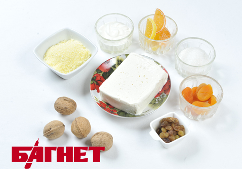 Ингредиенты: творог – 200 г, сметана – 1 ст. ложка, сахар – 1 ст. ложка, изюм – 4 шт., курага – 100 г, мармелад – 100 г, хлопья кукурузные – 50 г.