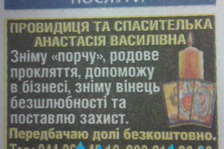 В «Киеве на ладонях» такие объявления зачастую встречаются в разделе «Услуги». Действительно, услуги здесь на любой вкус: внимательный читатель находит информацию о том, как наследственная предсказательница ставит защиту от всех уровней сглаза, ясновидящая и «спасительница» снимет порчу и родовое проклятие, и как «высококлассный профессионал, владеющий неисчерпаемой силой и энергией, найдет выход из любой (!) ситуации». А некоторые прорицатели скромно не называют свое имя, сэкономив рекламную прощадь на заглавную фразу большими буквами «ПРИВОРОЖУ!!!».