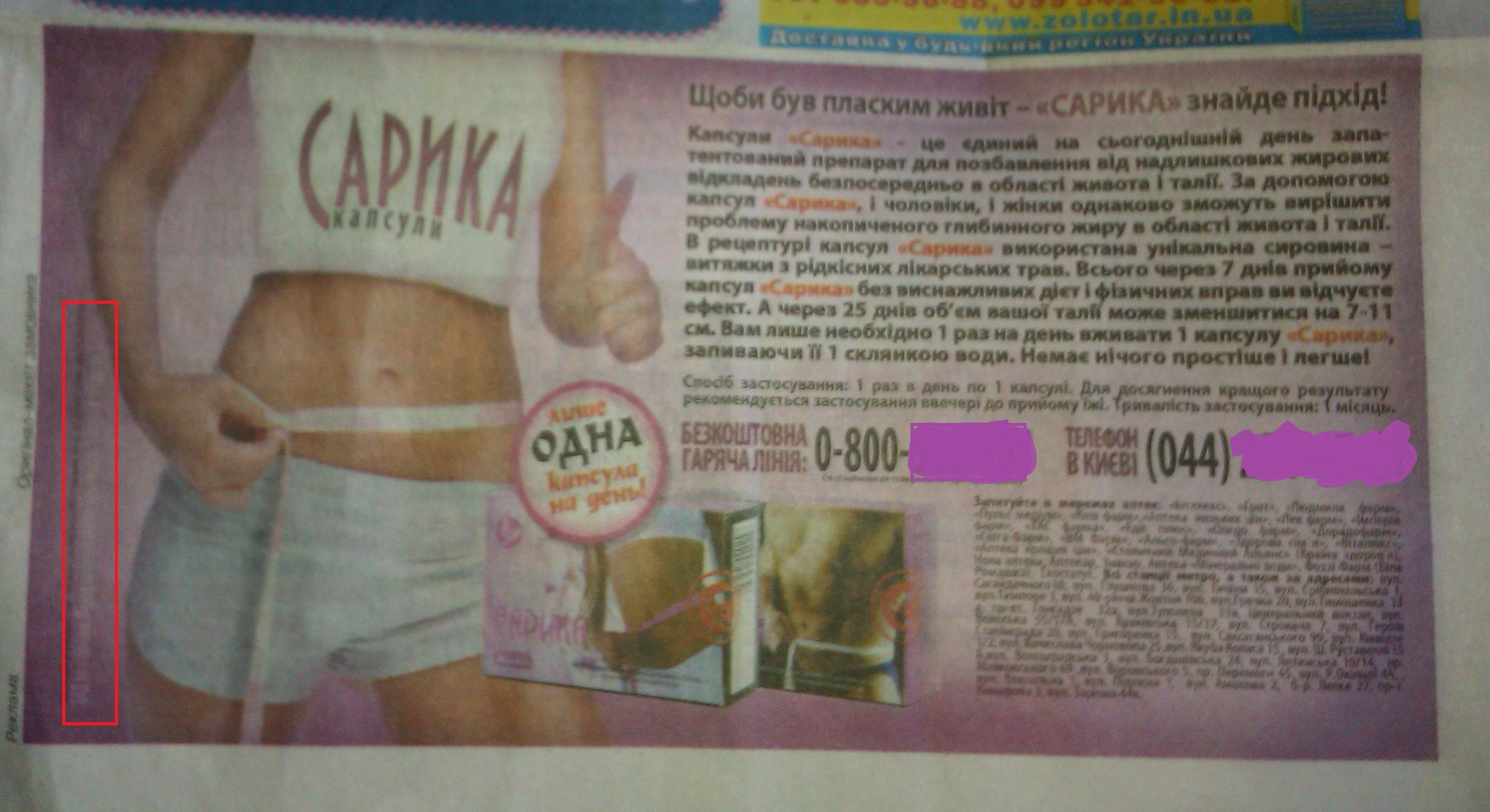 Открываем газету и видим рекламу с горящим предложением удалить «глубинный жир» на талии и животе. Находим в тексте заманчивую формулировку «это единственный запатентованный препарат для удаления жира непосредственно в области живота и талии».