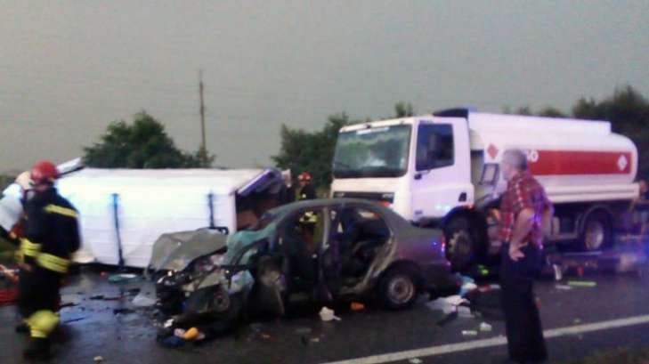 Страшная авария произошла на 451-м километре автодороги "Борисполь – Днепр - Запорожье". В столкновении участвовали легковые автомобили Volkswagen и Daewoo Lanos, а также грузовой микроавтобус Mercedes Spriter, а также многотонный грузовик DAF.