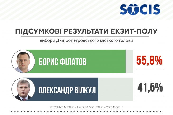 Выборы кандидатов на пост городского главы Днепропетровска с показателем поддержки почти 56% выиграл лидер «Украинского объединения патриотов - УКРОП» Борис Филатов. Его оппонент набрал всего лишь 41,5% голосов. Исследование социологов является репрезентативным, так как компания проводила опрос на 75 избирательных участках в пределах всего города, которые размещены равномерно по всей территории. На каждом участке в зависимости от его размера было опрошено от 51 до 66 избирателей. Всего количество респондентов составило 4055 избирателей. Данные исследования приведены по состоянию на 19:30.