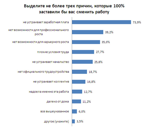 Что же наверняка заставляет нашего человека задуматься о смене работы? Здесь среди наиболее весомых причин были названы: низкая зарплата (74%), отсутствие возможности для профессионального роста (39,2%) и для карьерного роста (35%), а также плохие условия работы (27,7%). Плохие отношения с начальством заставят уйти 25,8% сотрудников, также для многих важны официальное трудоустройство и отношения в коллективе (18,7% и 12,7% соответственно).