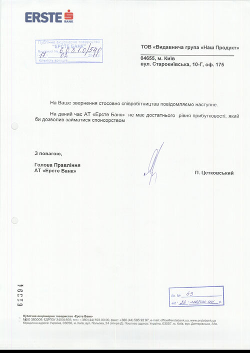 Ответ, который поступил в редакцию от финучреждения за подписью председателя правления АО «Эрсте банк» Павла Цетковского, был удивительно лаконичным: «В настоящее время АО «Эрсте Банк» не имеет достаточного уровня прибыльности, который позволил бы заняться спонсорством» (см.ниже).