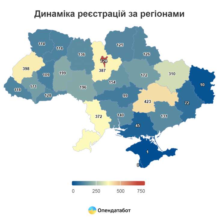 Регионально определились три лидера регистрации – Киев, Днепропетровская и Харьковская области. Инфографика показывает динамику регистрации ФЛП в целом по Украине с другими видами регистрации.