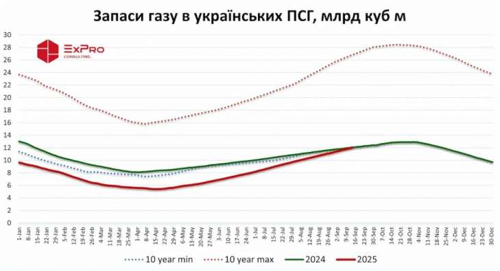 Станом на 14 вересня Україна накопичила 12,055 млрд кубометрів "блакитного палива". Про це повідомляє консалтингова компанія ExPro.