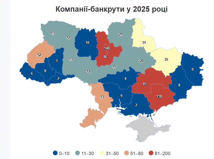 Статистика свидетельствует, что "чаще всего банкротятся ООО – это 84% случаев в 2025 году". В отраслевом разрезе больше всего пострадали оптовая торговля (266 предприятий) и сельское хозяйство (71 компания). Географически наибольшее количество дел открыто в Киеве (140) и Запорожской области (138).