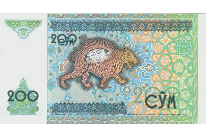 Этот тигр на узбекской купюре в 200 сумов срисован с медресе на площади Регистан в Самарканде, построенной в 17-м веке.