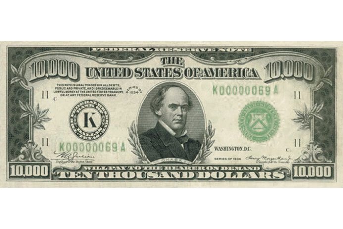 Банкноты номиналом в 10 тысяч долларов (с портретом Салмона Чейза, 23-го губернатора штата Огайо)