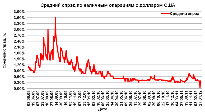 Средний спрэд по наличным операциям с долларом США за прошедшую неделю повысился на 0,34% до уровня 0,38%, что является умеренной величиной, и не дает пока оснований для беспокойства.