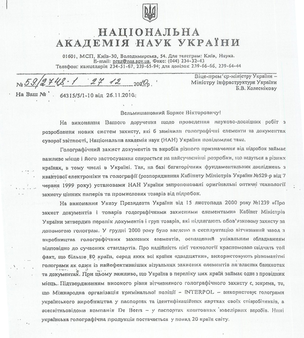 «Поднятие вопроса о полном отказе от голографических защитных элементов является необоснованным, потому что убедительных доводов недостаточной надежности и дороговизны голографических элементов, которые применяются в Украине, НЕ СУЩЕСТВУЕТ. Более того – принятие подобного решения может стать первым прецедентом в кругу стран, которые заботятся о собственной надежной безопасности», - писал президент НАНУ. (см.документ)