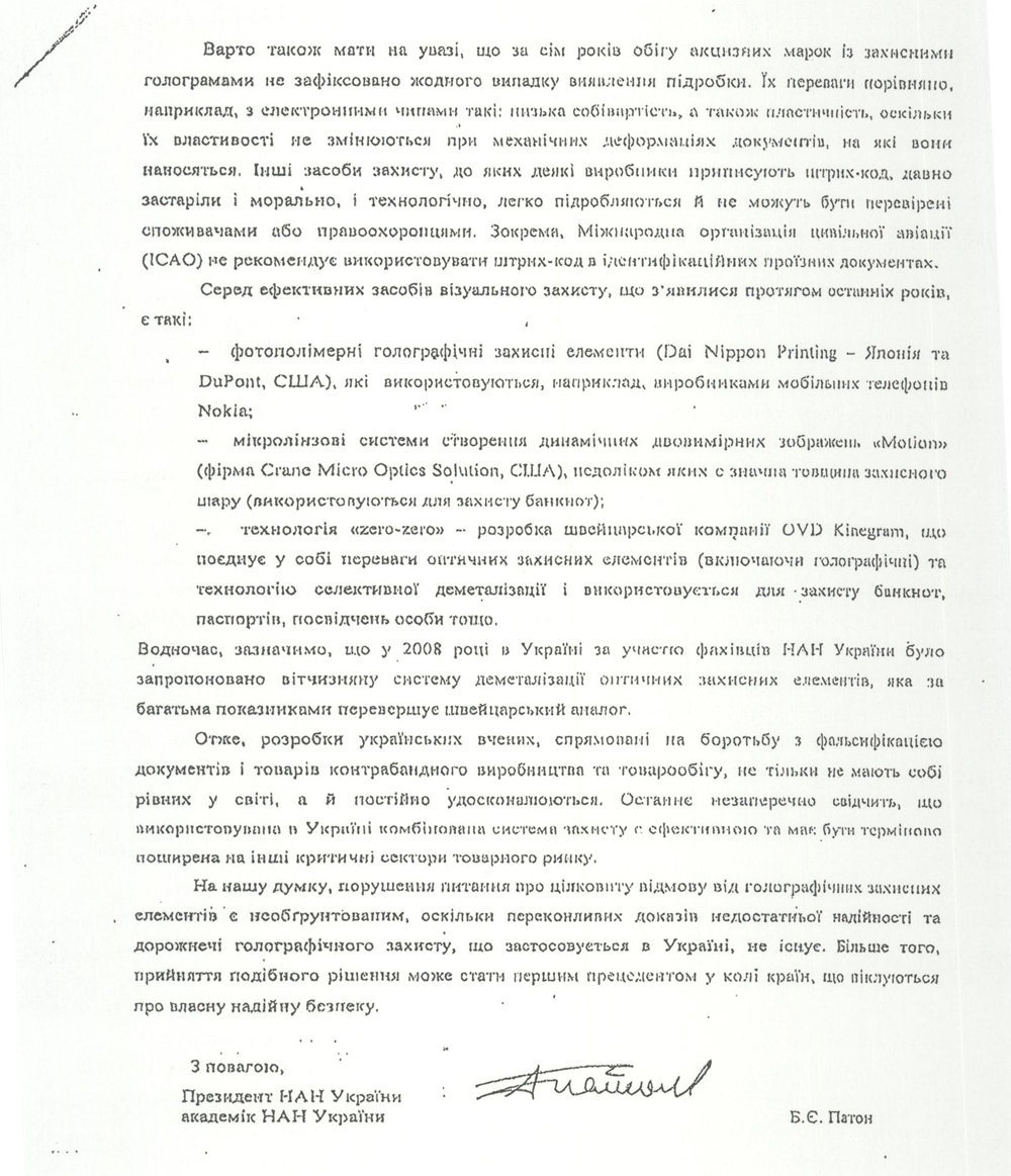 Более того, еще в 2010 году Президент Национальной академии наук Украины Борис Патон в письме на Кабинет Министров Украины называл идею отказа от ГЗЭ на акцизных марках необоснованной.
