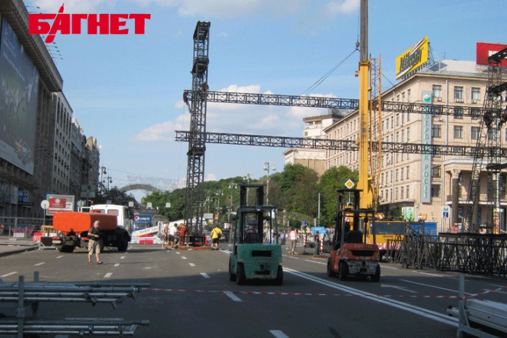 На одном из участков фан-зоны в центре Киева возле станции метро «Крещатик» несколько рабочих, участвовавших в строительстве объектов к ЕВРО-2012, 7 июня приковали себя к каркасам ограждения, заявляя, что работодатели обманули их.