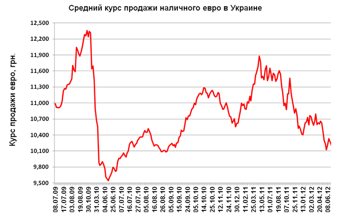 Курс продажи безналичного евро в Украине за прошедшую неделю повысился на 0,36% до 10,13 грн. Средний курс продажи наличного евро понизился на 0,59% - до 10,163 грн.