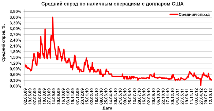 Средний спрэд по наличным операциям с долларом США за прошедшую неделю понизился на 0,03% до уровня 0,31%, что говорит о стабильности валютного рынка в Украине.