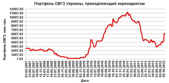Вложения нерезидентов в украинские ОВГЗ за предыдущую неделю снизились на 1,19% до 6,0356 млрд грн., что связано с окончанием парламентских выборов и продолжающейся умеренной девальвацией гривны.