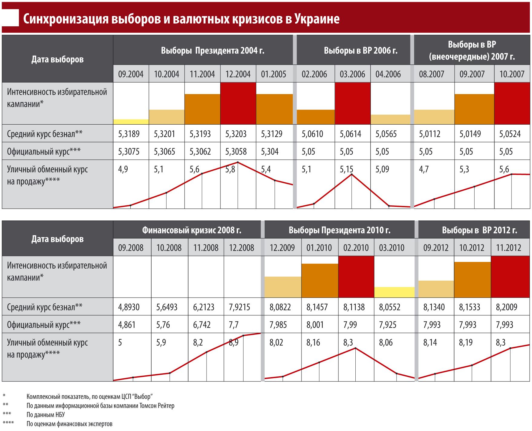 Валютные «качели», которые устраивают экспортеры-менялы, для экономики Украины страшнее самого глубокого мирового кризиса. Если проанализировать динамику колебаний цен на наличный доллар США за последние 8 лет, то четко прослеживается взаимосвязь между выборами и стоимостью американской валюты в украинских гривнах. Так, в 2004 году на фоне сложных президентских выборов в три тура доллар США дорожал почти до 6 грн. за единицу, парламентские выборы взвинчивали цены на доллар США в 2006 году и до 8,16 грн. Последние по хронологии выборы – парламентские в октябре 2012 года – подняли курс до 8,30 грн. Причем в 2004 и 2006 годах не было серьезных внешних негативов, которые могли бы столкнуть гривну вниз. Заметный обвал гривны был в 2008 году на фоне серьезнейшего мирового финансового кризиса. Тогда украинская валюта обесценилась почти до 9 грн. Сейчас цены подбираются к той «яме».