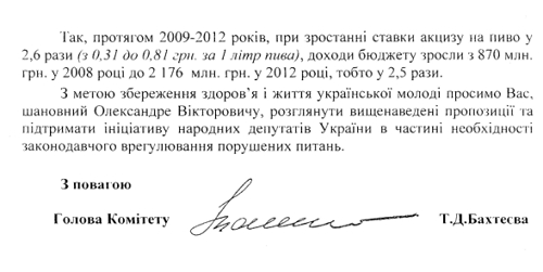 Глава комитета Верховной Рады по вопросам Татьяна Бахтеева обратилась к министру доходов и сборов Украины Александру Клименко с письмом, в котором просит увеличить акцизы на пиво в три раза и законодательно отнести пиво к алкогольным напиткам, сообщает from-ua.com. (см. фото документа ниже).