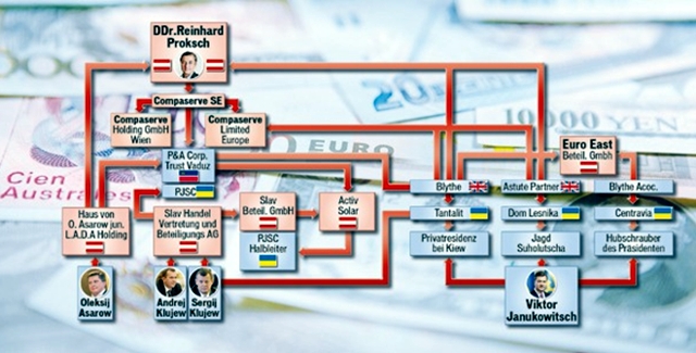 По его данным, распорядителем и серым кардиналом фирм Януковича в Австрии был и остается финансовый менеджер Райнхард Прокш. На нем были завязаны все фирмы клана через фирму Compaserve SE (смотрите графику). Прокш - это коренной житель Лихтенштейна с австрийским паспортом, он организует также денежные операции украинского экс-премьера Азарова и братьев Андрея и Сергея Клюевых.