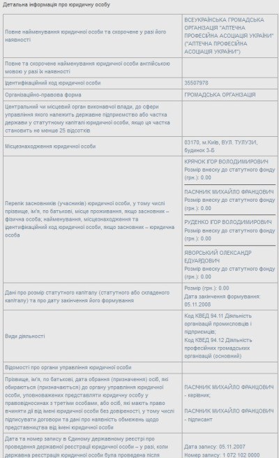 Видимо, аптечная сеть, не имеющая к господину Пасечнику никакого отношения, настолько сознательна, что посчитала именно эту информацию достойной центрального места на Главной странице своего сайта, да еще и шрифтом в 4 раза больше стандартного. Кроме того, официальный реестр предприятий и организаций irc.gov.ua по запросу о Аптечной профессиональной ассоциации Украины, от управления которой также открещивается новый Глава Гослекслужбы, выдает именно его данные как руководителя и подписанта организации:
