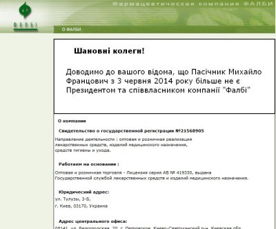 Пресс-релиз содержит следующее: “Информация о том, что Глава Гослекслужбы Украины М. Пасечник якобы является собственником фармацевтической компании или главой общественного объединения, не соответствует действительности”. То, что Гослекслужба Украины назвала “информацией, которая появилась в некоторых СМИ касаемо якобы существования конфликта интересов нового Главы Гослекслужбы”, на самом деле в большинстве СМИ является публикациями касаемо предыдущей трудовой занятости Михаила Пасечника. Именно эта информация в релизе Гослекслужбы от 24 июня 2014 г. стала поводом для публикаций. По состоянию на 18:00 24 июня 2014 г. сайт аптечной сети “Фалби” разместил на Главной странице недвусмысленное обращение: