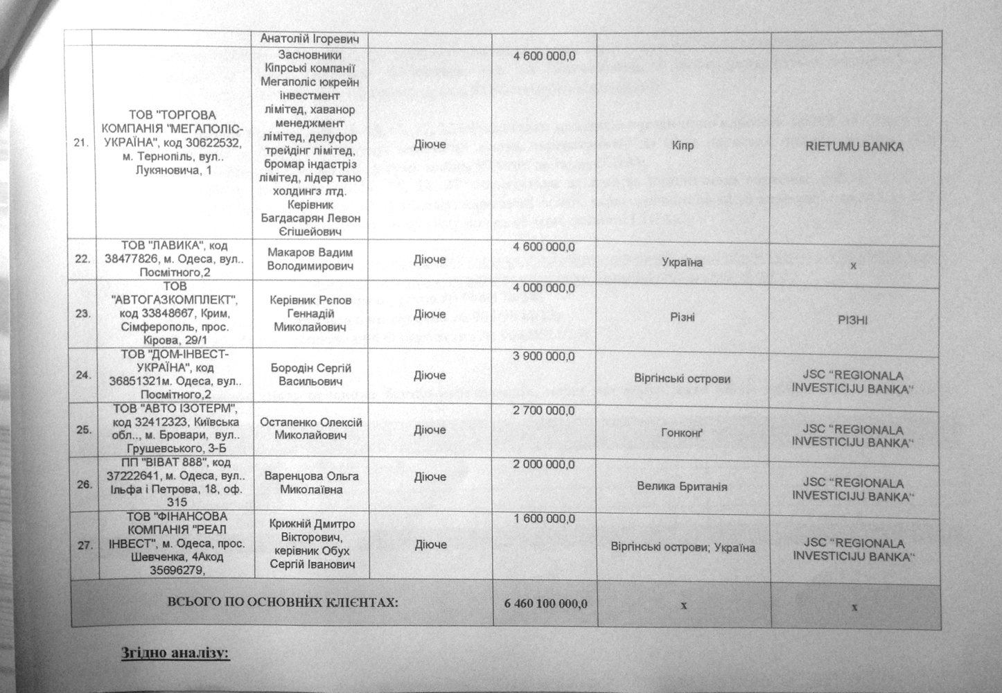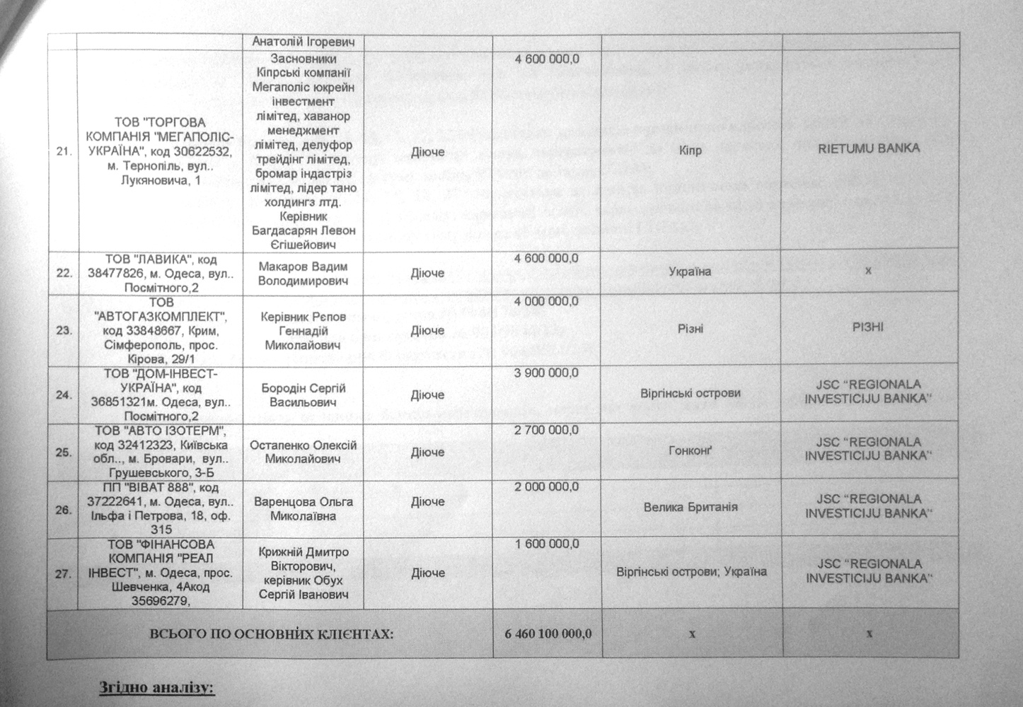 Установлено двадцать семь транзакций общим объемом 6,5 млрд долларов США из Украины в оффшорные зоны. Их осуществили в 2013-2014 годах два банка, подконтрольных одесскому бизнесмену Борису Кауфману – ПАТ «Финбанк» и ПАТ «Платинум Банк»
