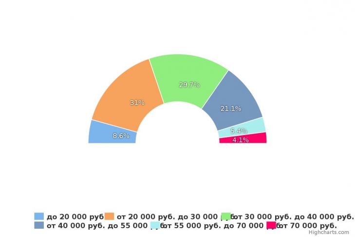 Средний уровень заработной платы в ноябре 2015 года возрос до отметки 36 195 рублей по сравнению с октябрем, когда он составлял 33 380 рублей. Оценить какой процент предлагаемых вакансий может дать достойный заработок, можно по диаграмме «Распределение количества вакансий в % по уровню заработной платы в Московской области» в разделе «Статистика» на сайте Трудбокс.